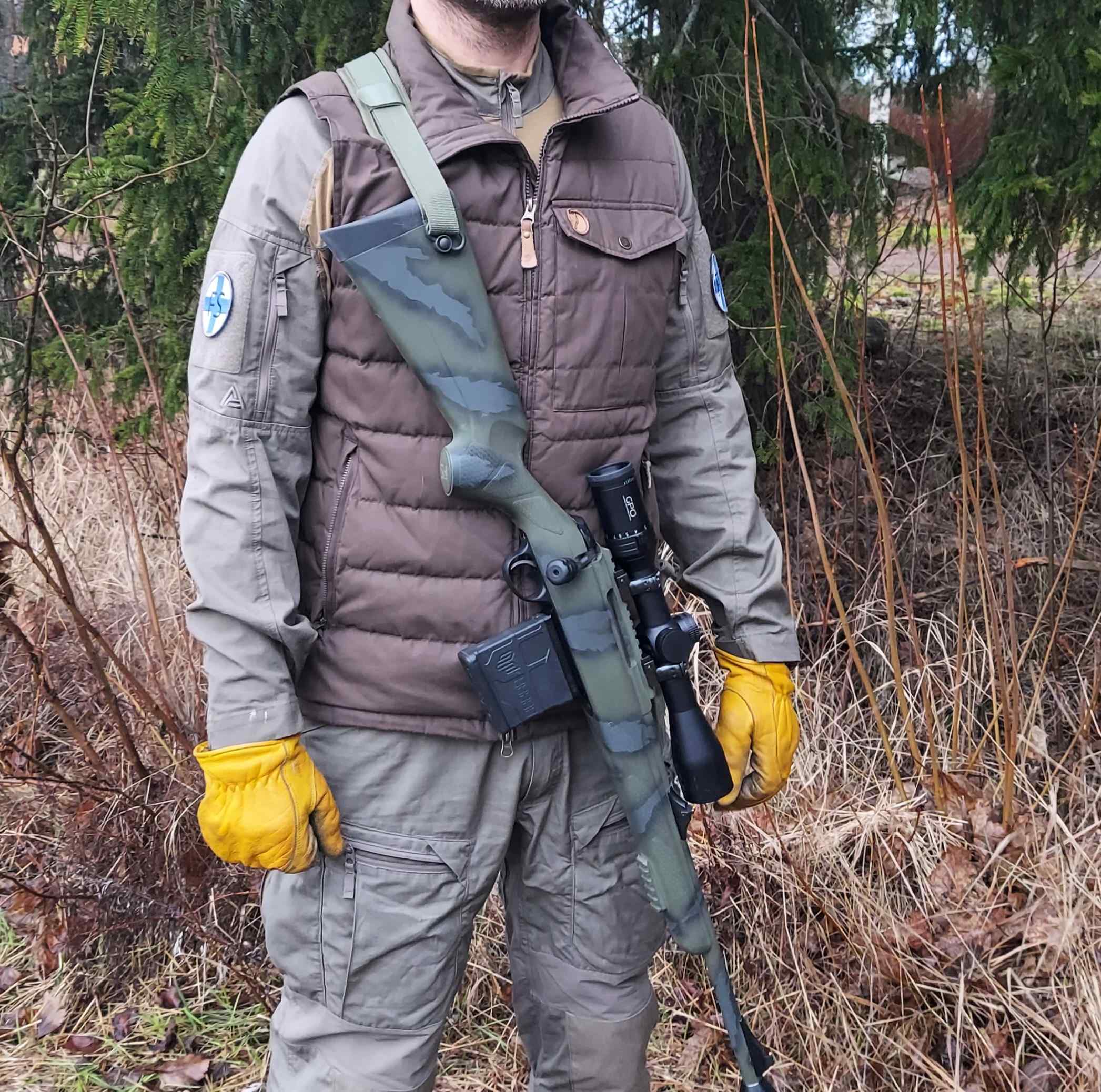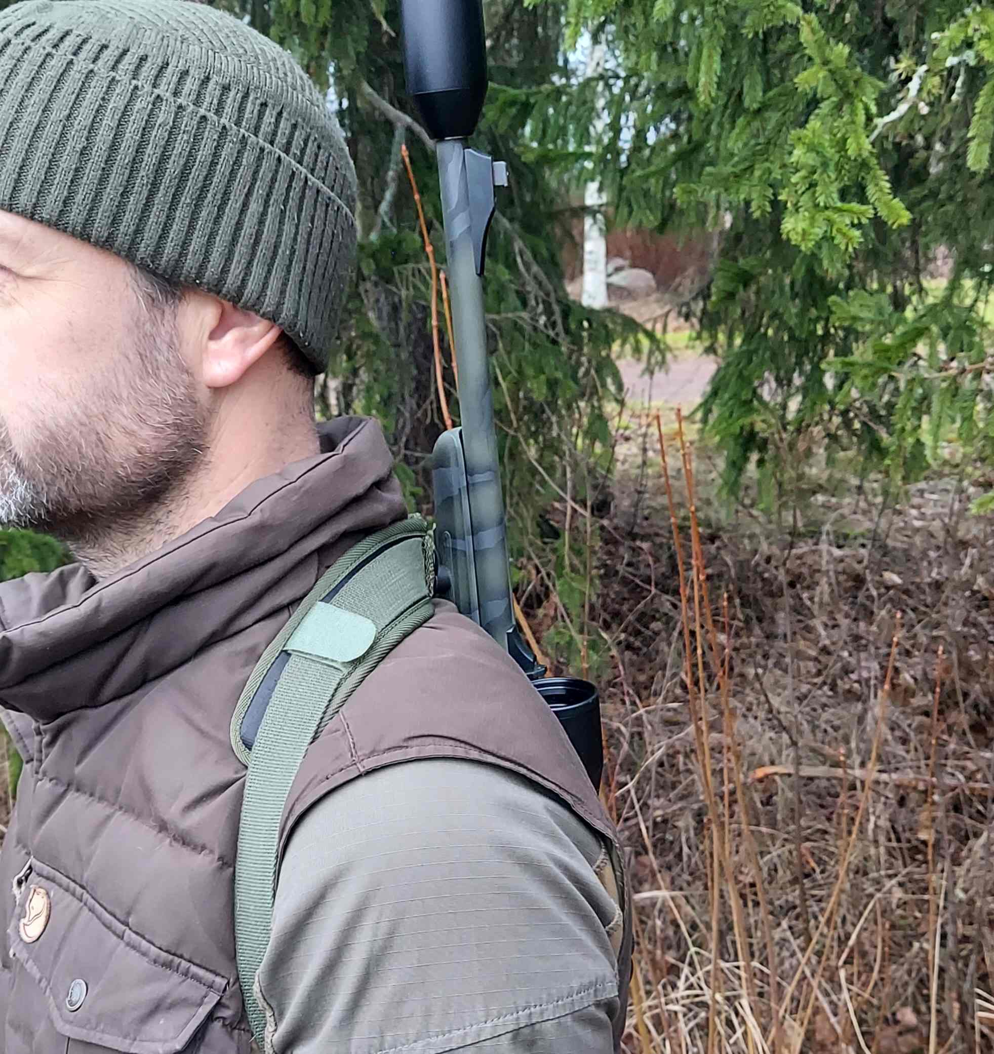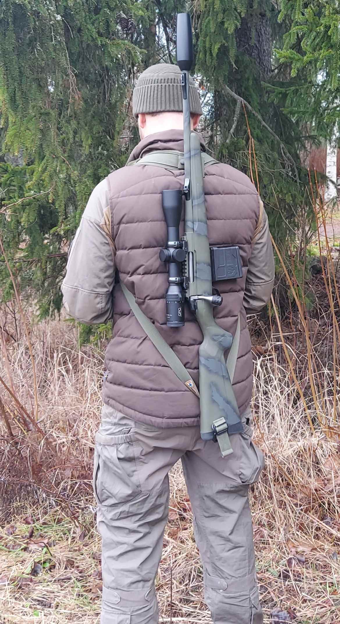 One carry method to carry your weapon with The One Sling is a biathlon style weapon harness. You can carry your rifle like a backpack on your back. You can add a separate padding to the sling. With separate padding, it is very comfortable to carry even a heavy rifle this way.
